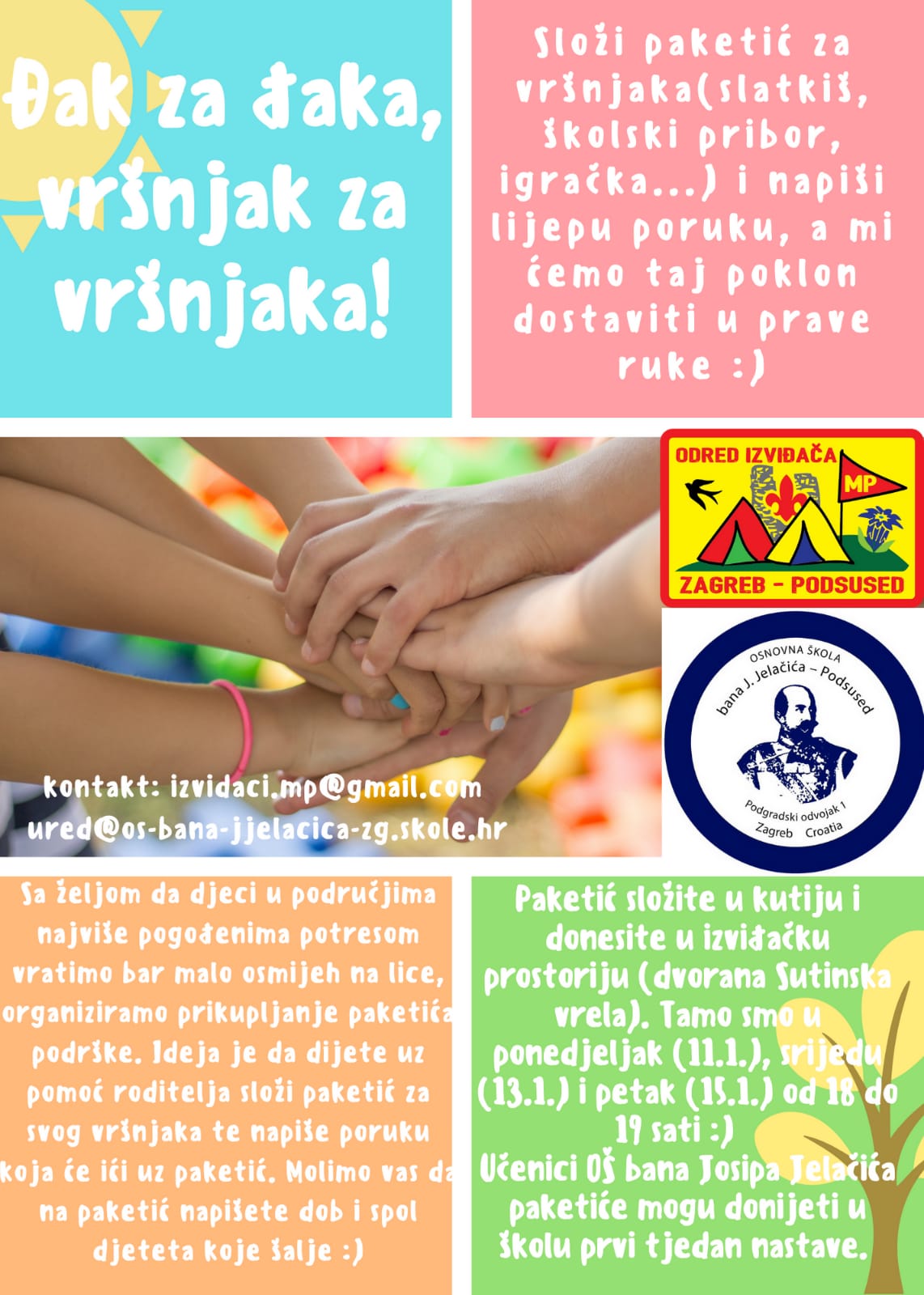 Dragi učenici, poštovani roditelji, pozivamo vas da se uključite u humanitarnu akciju Đak za đaka, vršnjak za vršnjaka! Djelatnici Škole i Odred izviđača Zagreb - Podsused